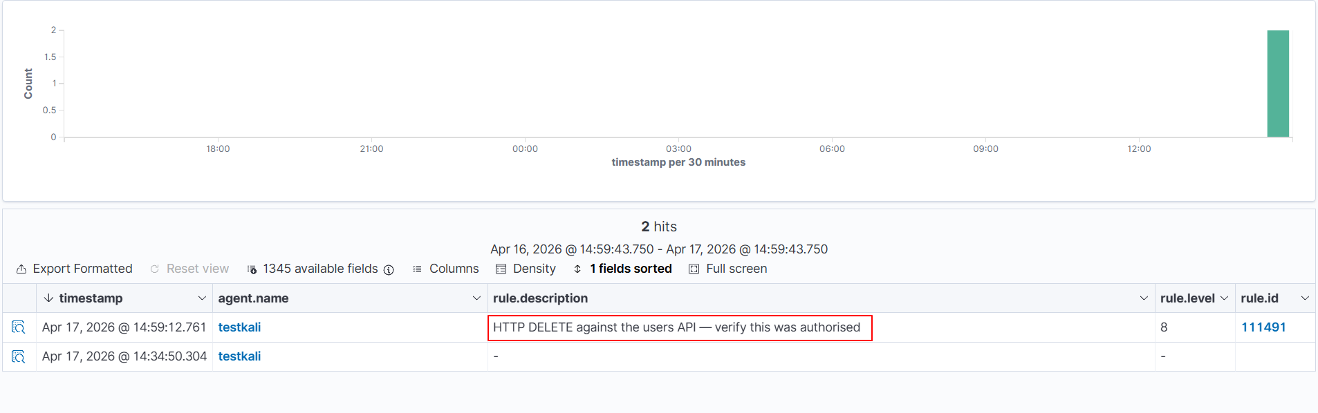 192.168.1.50 - admin [10/Apr/2026:11:05:44 +0000] "DELETE /api/users/42 HTTP/1.1" 200 88Rule: