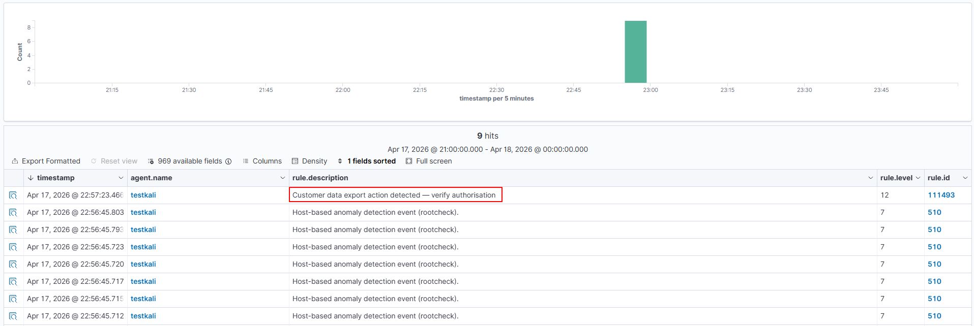 The inner <group> tag maps your alert to compliance frameworks like PCI DSS or GDPR. The <mitre> tag connects it to an ATT&CK technique ID. Skip them if you're in a hurry but if you add them, Wazuh's built-in compliance dashboards pick up your custom rules automatically. That's a nice thing to get for free.