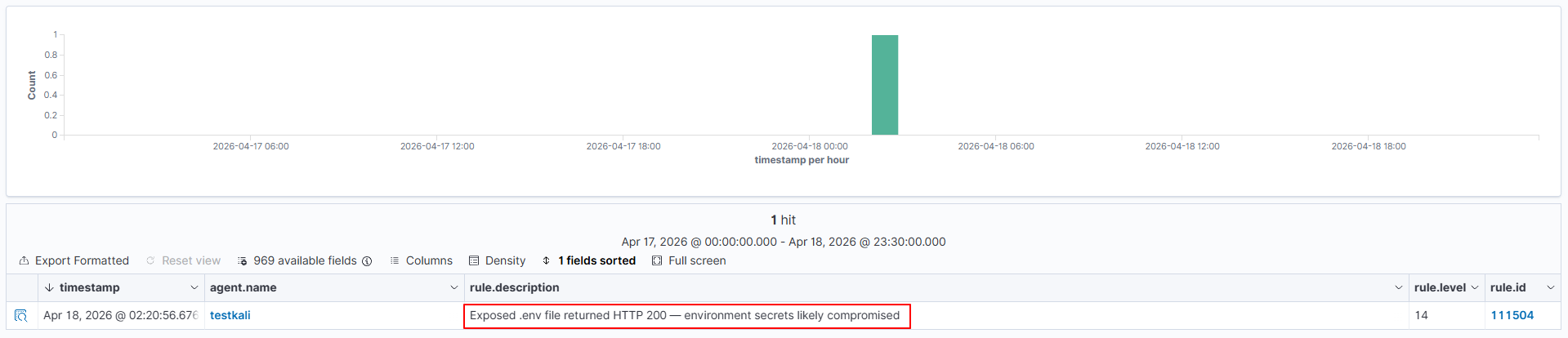 45.33.32.156 - - [10/Apr/2026:19:12:00 +0000] "GET /.env HTTP/1.1" 200 512Rule: