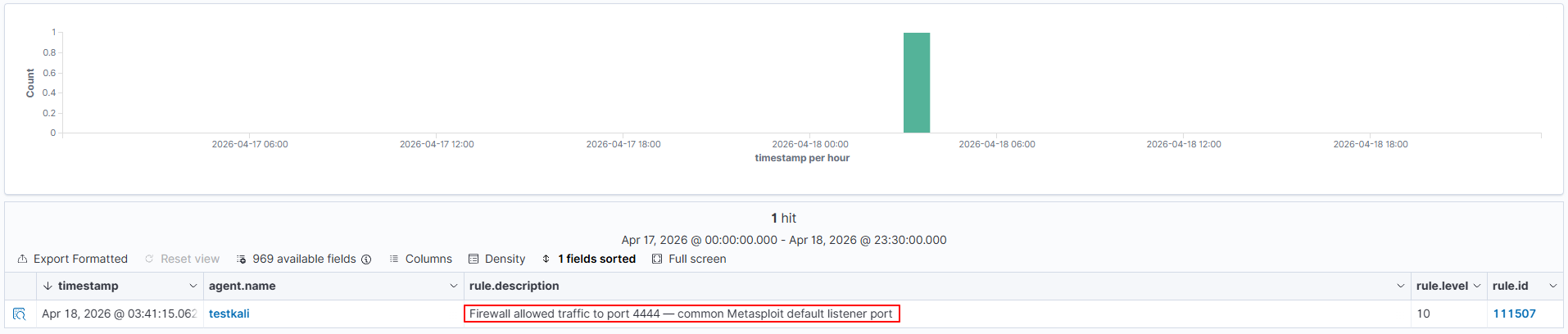 <description>Firewall allowed traffic to port 4444 — common Metasploit default listener port</description>