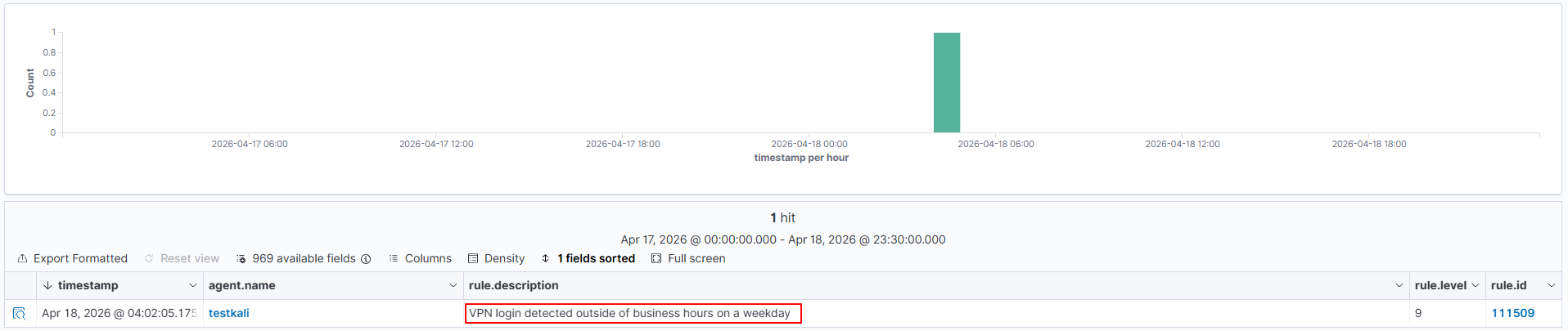 A VPN login at 2am on a Tuesday hits differently than the same login at 10am. These two options let you express that. <time> takes a range in hh:mm-hh:mm format. <weekday> takes a day name or the shortcuts weekdays and weekends. One thing to get right first: both use the Wazuh server clock, not the timestamp inside the log. Wrong server timezone = wrong results. Check it.